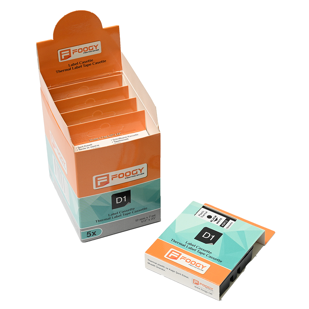 Foogy D1 Termal Şerit Etiketler; Dymo LabelManager etiket yazıcılarda kullanabileceğiniz %100 uyumlu ve garantili muadil termal etiketlerdir.